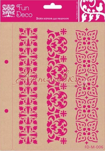 Трафарет многоразового использования на клеевой основе, изготовлен из прозрачного пластика. Имея в своем ассортименте инструментов такой предмет для декорирования Вы сможете создавать разные узоры на таких поверхностях, как дерево, изделия их ткани, керамические заготовки, фанера, пластик, стекло, метал. Для нанесения изображения можно использовать акриловые краски, объемные пасты и гели, шпаклевку и объемные краски, а инструменты можно подобрать разные: кисти , спонжи, мастихины. После использования инструменты и заготовки рекомендуется тут же теплой водой промыть . После того, как высохнет, прикрепите его на гладкую поверхность (упаковку для трафарета).