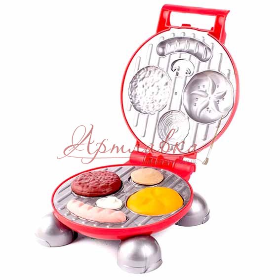 А также для интересной игры в наборе дополнительные инструменты: барбекю машина, дощечка с формочками, формочка-тостер, стек, скалка, тарелка – 2 шт., вилка – 2 шт., чем – 2 шт., игровое поле, набор пакетиков для хранения теста, инструкция.