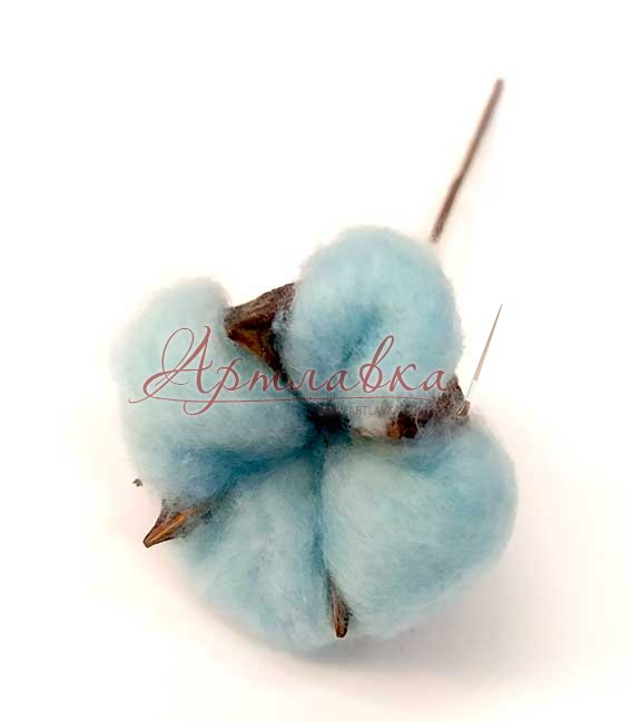 Декоративная ветка на проволочном основании с одним цветком хлопка голубого цвета.