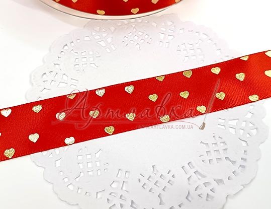 Лента атласная Красная с золотыми сердечками, 2,5см
