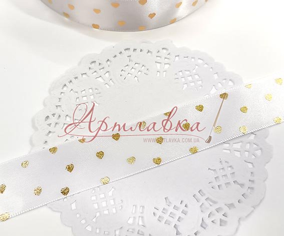 Лента атласная Белая с золотыми сердечками, 2,5см