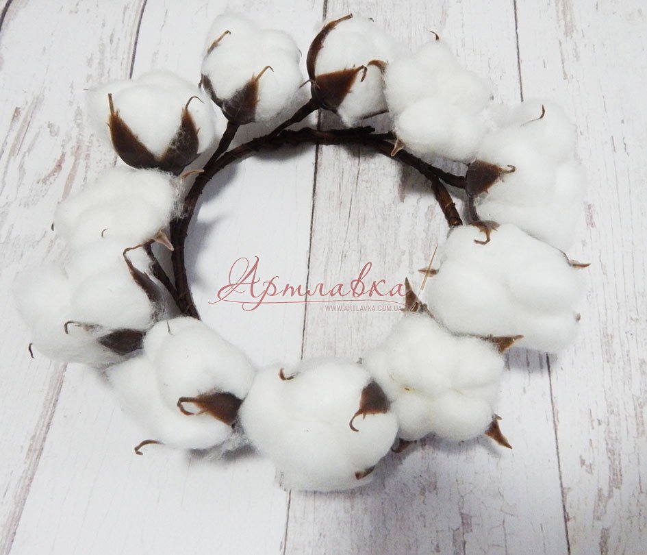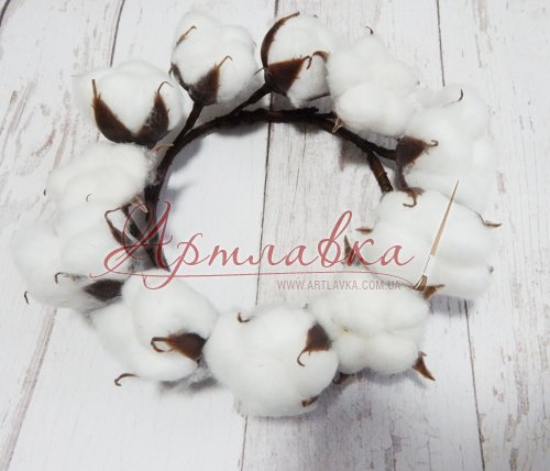 Декоративный веночек с цветками хлопка может служить как самостоятельным предметом для декора, так и быть основой для создания других композиций. Так Вы можете украсить такой интерьерный веночек хвойными ветками, бубенчиками, лентой из мешковины, натрульными шишками и сухоцветами. Цветочки расположены на проволоке, что позволяет их сгибать и придавать нужную форму или наклон.