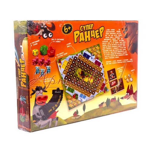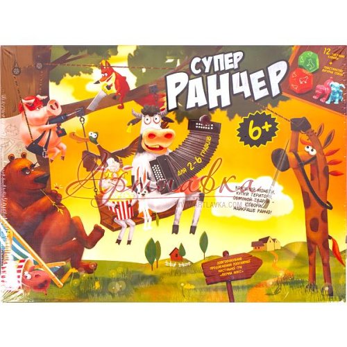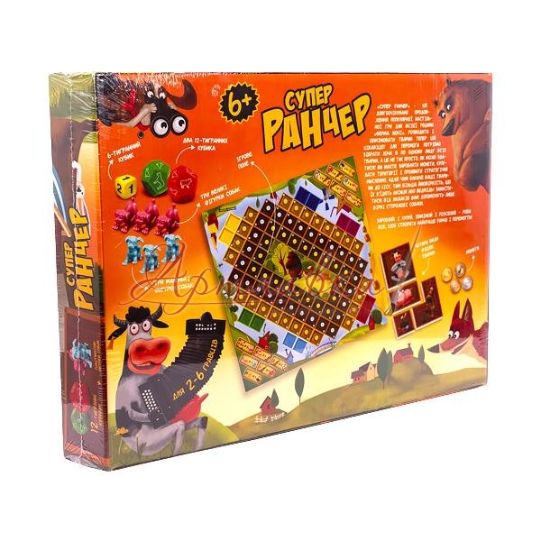 "Супер Ранчер" (оформление на украинском языке) - это долгожданное продолжение популярной настольной игры "Ферма Люкс".Для победы нужно собрать хотя бы по одному виду всех животных. Вам предстоит зарабатывать монеты, покупать территории и проявить стратегическое мышление. Комплект содержит: игровое поле, фишки с животными 96шт, двенадцатигранный кубик 2шт, шестигранный кубик 1шт, монеты 100шт, фишки собственности 200шт, фигурки собак 6шт, инструкция. Для детей возрастом от 6 лет. Размер упаковки: 39*29*5 см