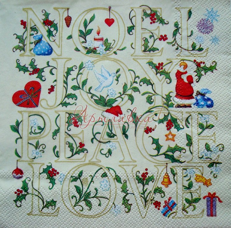 Декупажная салфетка "Peace-Love-Joy", 33*33 см