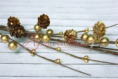 Декоративная воточка на проволочной основе с золотистыми шишками и бусинами для создания новогодних интерьерных композиций, венков, икебан и букетов.