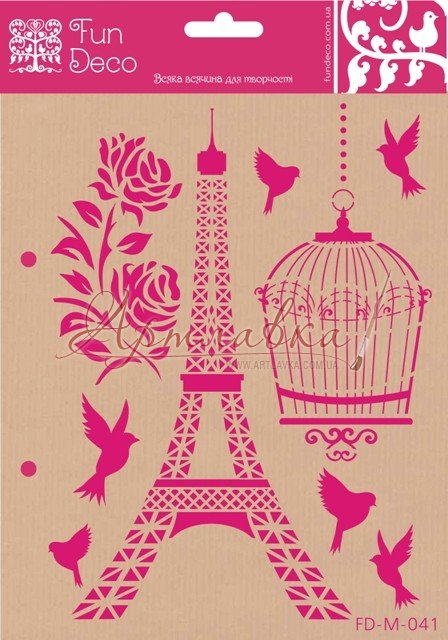 Трафарет багаторазового використання на клейовій основі, виготовлений із прозорого пластику. Маючи у своєму асортиментах інструментів такий предмет для декорування Ви зможете створювати різні візерунки на таких поверхнях, як дерево, вироби їх тканини, керамічні заготовки, фанера, пластик, скло, метав. Для нанесення зображення можна використовувати акрилові фарби, об'ємні пасти й гелі, шпаклівку й об'ємні фарби, а інструменти можна підібрати різні: пензлі, спонжі, мастихіни. Після використання інструменти й заготовки рекомендується відразу теплою водою промити . Після того, як висохне, прикріпите його на гладку поверхню (упакування для трафарету).