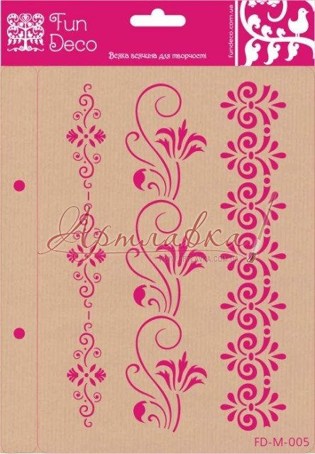 Трафарет багаторазового використання на клейовій основі, виготовлений із прозорого пластику. Маючи у своєму асортиментах інструментів такий предмет для декорування Ви зможете створювати різні візерунки на таких поверхнях, як дерево, вироби їх тканини, керамічні заготовки, фанера, пластик, скло, метав. Для нанесення зображення можна використовувати акрилові фарби, об'ємні пасти й гелі, шпаклівку й об'ємні фарби, а інструменти можна підібрати різні: пензлі, спонжі, мастихіни. Після використання інструменти й заготовки рекомендується відразу теплою водою промити . Після того, як висохне, прикріпите його на гладку поверхню (упакування для трафарету).