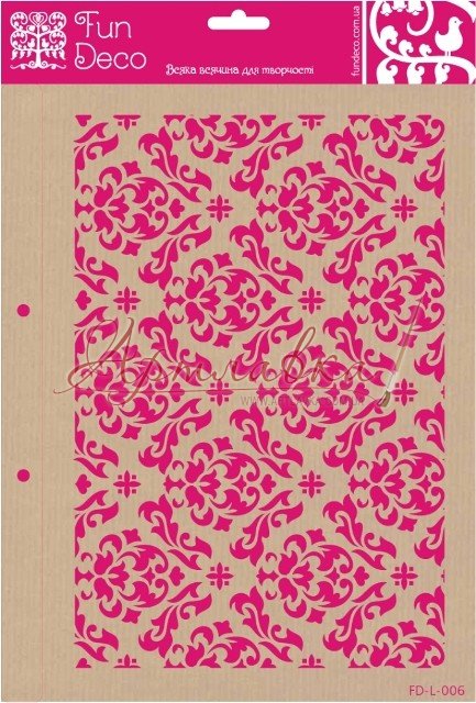 Трафарет багаторазового використання на клейовій основі, виготовлений із прозорого пластику. Маючи у своєму асортиментах інструментів такий предмет для декорування Ви зможете створювати різні візерунки на таких поверхнях, як дерево, вироби їх тканини, керамічні заготовки, фанера, пластик, скло, метав. Для нанесення зображення можна використовувати акрилові фарби, об'ємні пасти й гелі, шпаклівку й об'ємні фарби, а інструменти можна підібрати різні: пензлі, спонжі, мастихіни. Після використання інструменти й заготовки рекомендується відразу теплою водою промити . Після того, як висохне, прикріпите його на гладку поверхню (упакування для трафарету).