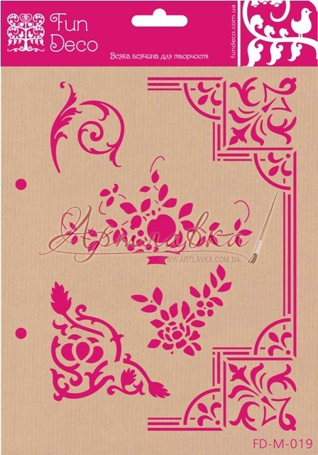 Трафарет багаторазового використання на клейовій основі, виготовлений із прозорого пластику. Маючи у своєму асортиментах інструментів такий предмет для декорування Ви зможете створювати різні візерунки на таких поверхнях, як дерево, вироби їх тканини, керамічні заготовки, фанера, пластик, скло, метав. Для нанесення зображення можна використовувати акрилові фарби, об'ємні пасти й гелі, шпаклівку й об'ємні фарби, а інструменти можна підібрати різні: пензлі, спонжі, мастихіни. Після використання інструменти й заготовки рекомендується відразу теплою водою промити . Після того, як висохне, прикріпите його на гладку поверхню (упакування для трафарету).