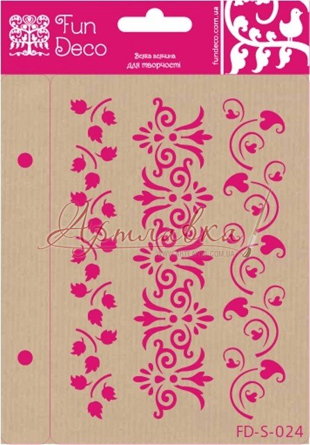 Трафарет багаторазового використання на клейовій основі, виготовлений із прозорого пластику. Маючи у своєму асортиментах інструментів такий предмет для декорування Ви зможете створювати різні візерунки на таких поверхнях, як дерево, вироби їх тканини, керамічні заготовки, фанера, пластик, скло, метав. Для нанесення зображення можна використовувати акрилові фарби, об'ємні пасти й гелі, шпаклівку й об'ємні фарби, а інструменти можна підібрати різні: пензлі, спонжі, мастихіни. Після використання інструменти й заготовки рекомендується відразу теплою водою промити . Після того, як висохне, прикріпите його на гладку поверхню (упакування для трафарету).