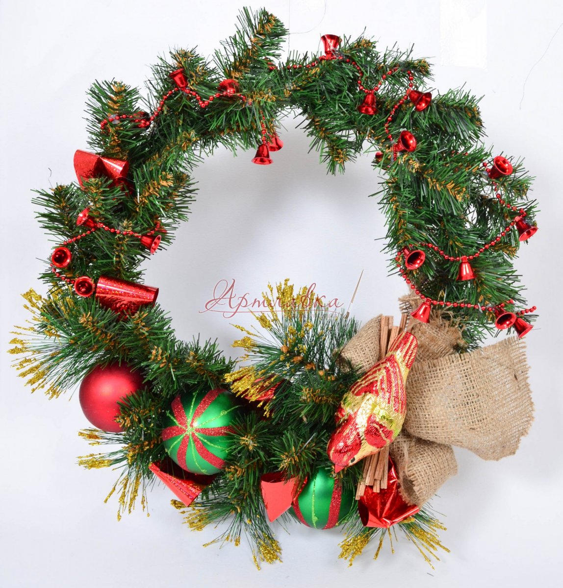 Середній розмір дозволяє вінку бути легеням і придатним для вертикального розміщення. Колірна гама - універсальна. Гармонічне комбінації яскраво-червоного й зеленого надихають і успакаівают одночасно. Унизу розташувалися маленькі мішечки й кілька ялинкових іграшок. Вони оригінально прикрашають усю композицію й зроблять Ваш інтер'єр неповторним. Купити якісний новорічний вінок запрошуємо в Артлавку