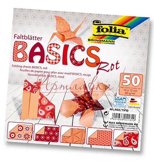 Папір для орігамі Basics, червоний орнамент, 15*15см, 50шт/уп, 5 мотивів