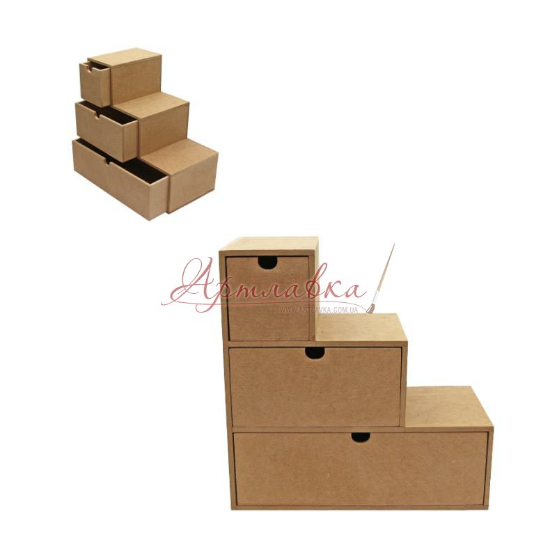Триступінчастий органайзер із МДФ відмінно підійде для зберігання різноманітних речей: невеликих іграшок, канцелярських приналежностей, прикрас, сувенірів, не дуже великих інструментів і т.д. На кухні такий комодик теж придасться для організації продуктів у маленьких баночках і пакетиках: чаю, кава й спецій, насолод і навіть господарських приналежностей – сірників, рукавичок, губок, пакетів.