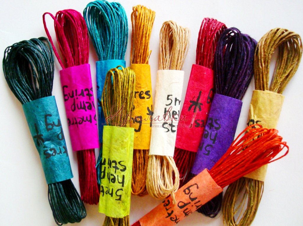 Натуральна прядив'яна нитка ( з конопельних волокон) пофарбована в яскраві кольори. Використовується для оригінального оформлення подарунків, листівок, фотоальбомів, нанизування намиста, створення прикрас і т.д Нитка міцна, тверда. Довжина 5 м. Виробник Khadi Papers (Індія)