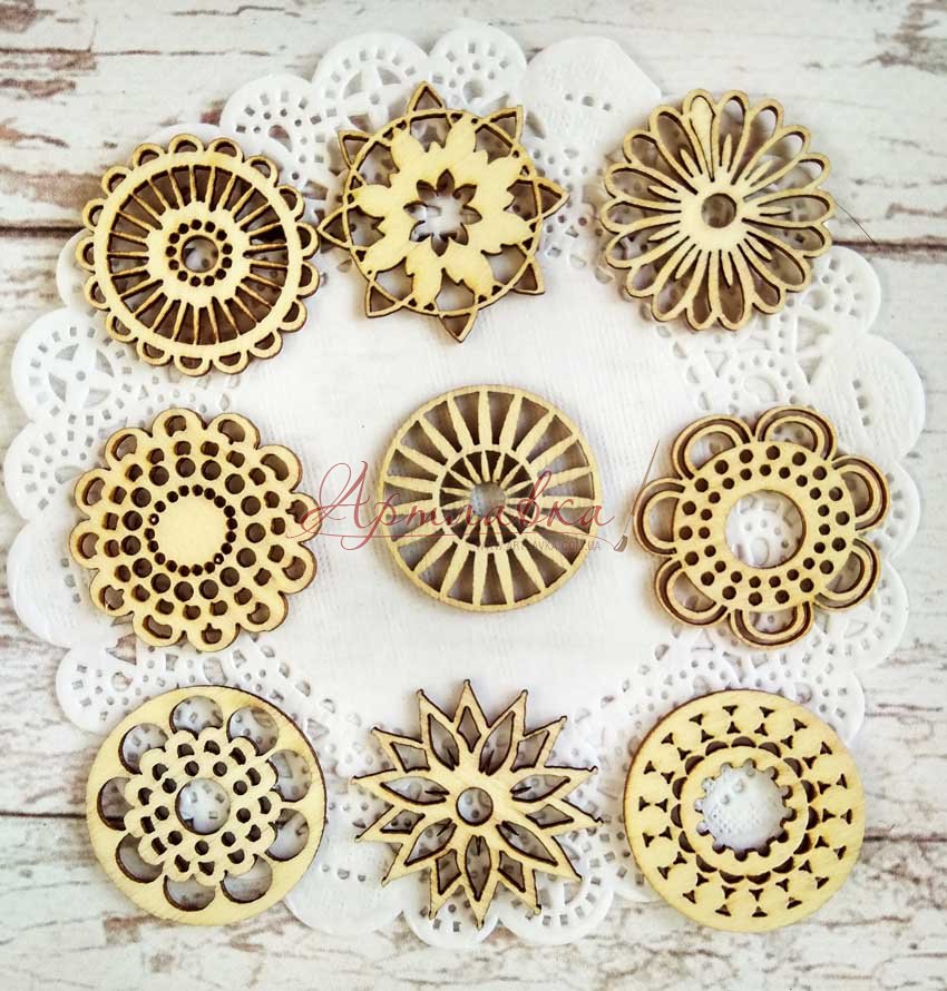 Набір фігурок з тонкої фанери, розміром близько 3 см кожна. Ідеально підходять для різних технік декорування, створення новорічних прикрас і сувенірів. Такими квіточками доречно буде доповнити різдвяну листівку або подарункове впакування, альбом або виріб у техніку декупаж. Дивна якість і оригінальна різьблені малюнки неодмінно порадують рукодільниць. У наборі 9 штучок.