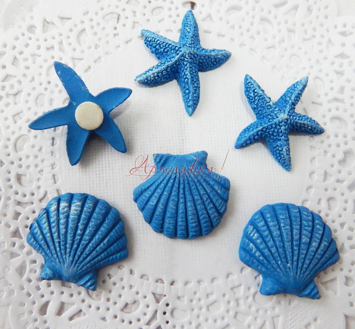 Керамічні фігурка^-фігурки-міні-фігурки дял декорування на липкій основі. У наборі морська зірочка й черепашка по три фігурки кожна. Розмір 2 см.