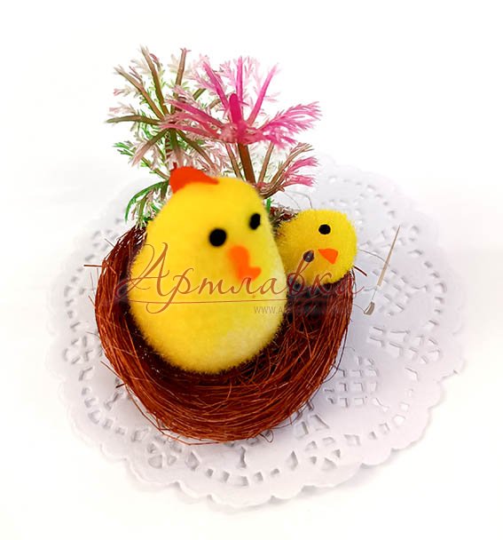 Декоративне гніздечко з курочкою, курчам у шкарлупі й маленькими білими яйцями й натуральним жовтим пером на картонній підкладці - відмінна композиція для створення великодніх декорацій, прикрас для будинку, віночків, ІКЕА, оформлення кошиків. Гніздо з лози розміром 5см у діамтром, висотою ок. 3см.