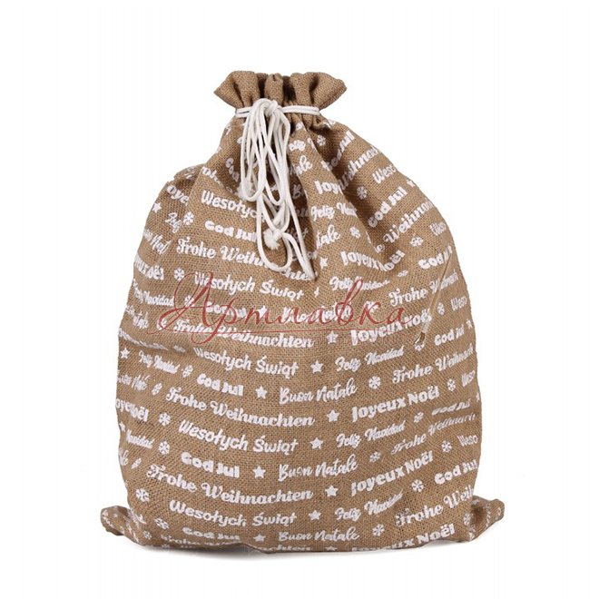 Новорічний мішок із принтом підійде для впакування великого подарунка для дітей і не тільки. Вам тепер не потрібно турбується про впакування - стильний мішок із щільної мішковини приємного натурального кольору з написами буде відмінним доповненням до новорічного настрою. Розмір мішка 60*45 см.