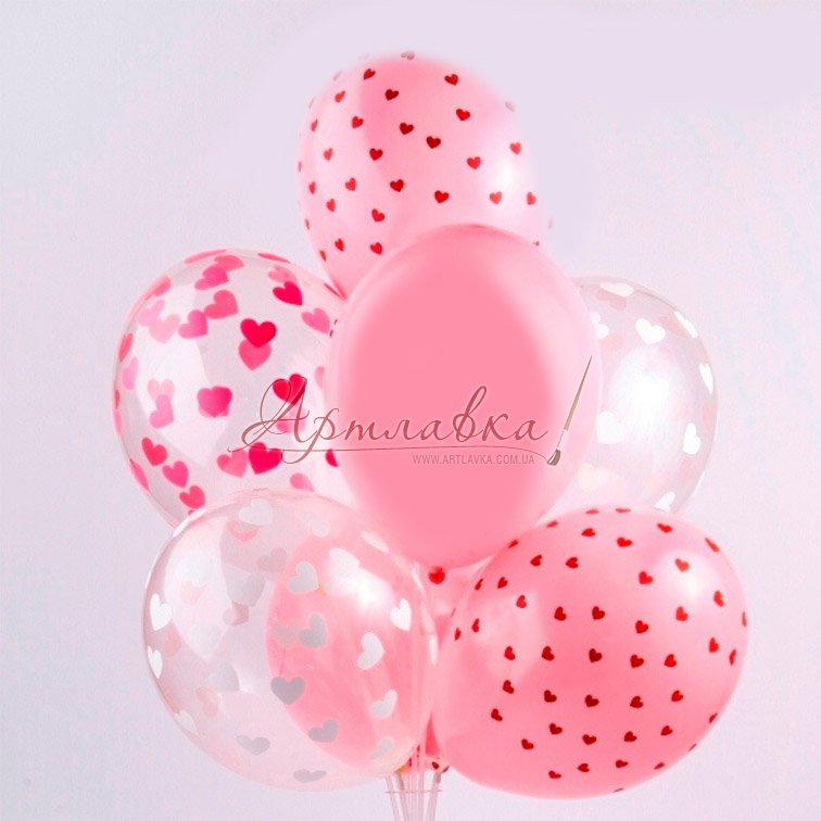 Високоякісні польські повітряні кульки для надування повітрям і гелієм. Серденька різного кольору - червоні, м'ятні на прозорій кульці/p>