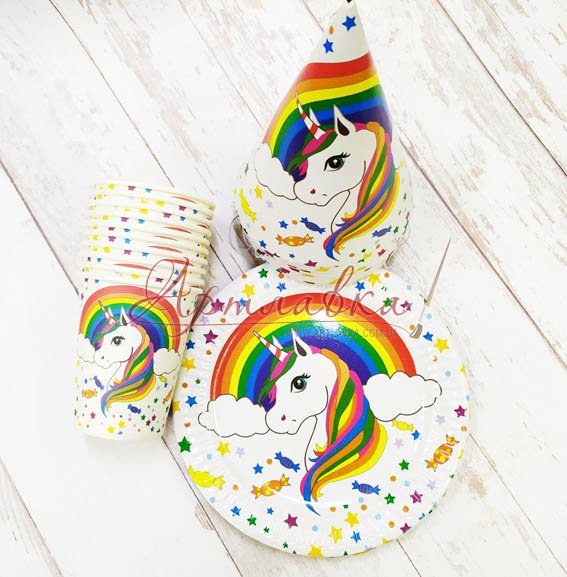 Набір паперового посуду для дитячого свята з актуальними малюнками. З таким комплектом свято буде яскравим, а гості задоволені. У наборі одноразові картонні стаканчики, тарілочки й святкові ковпачки з резинкою на 10 персон. Актуальний принт із райдужним єдинорогом порадує дівчинок і їх батьків.