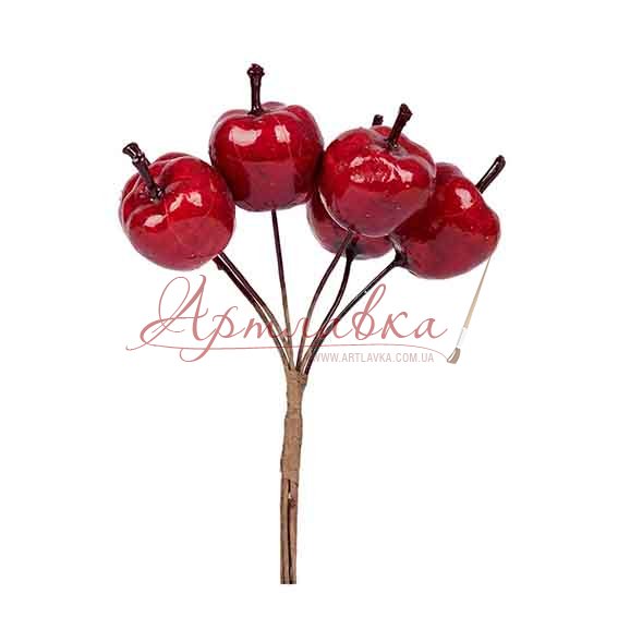 Декоративні міні яблучка в букетику на дротику. В упакуванні 6 шт. підходять для новорічного декору, композицій і ікебан, віночків і букетів, ободків і віночків. Висота гілки 12 см, діаметр яблучка 2 см.