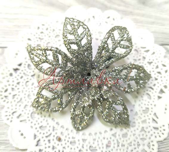 Пуансеттия із блискітками на прищіпці. Діаметр квітки 6 см. Підходить для оригінального зимового віночка, створення ікебан, букетів, різного декору.