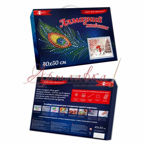 Набір для творчості "Алмазний живопис", на підрамнику Склад набору полотно з клейовою основою на дерев'яному підрамнику, розміром 40*50 см круглі стрази, розфасовані в пронумеровані пакетики-від 25 шт; пластикова ручка для приклеювання 3 додаткові насадки для ручки на 3, 6 та 9 страз; гелеподібний клей силіконовий пластиковий піддон для страз додаткові пакетики для страз – 25 шт; наклейки для нумерації додаткових пакетиків; кріплення для картини; мотузка для підвішування картини на стіну; докладна інструкція. Красива новорічна композиція – чудовий подарунок на День Миколи або Новий рік.