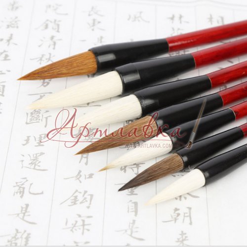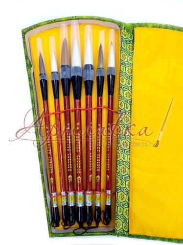 Набір пензлів для китайської каліграфії в акуратному подарунковому футлярі. У наборі сім пензлів різної довжини з натурального волосся. Натуральне волосся сприяє легкому всмоктуванню і утриманню туші, вологою фарби, що дозволяє ними працювати в різних техніках, писати акуратні ієрогліфи, малювати. В якості основи підійде рисовий папір, яка відмінно працює з китайською тушшю.