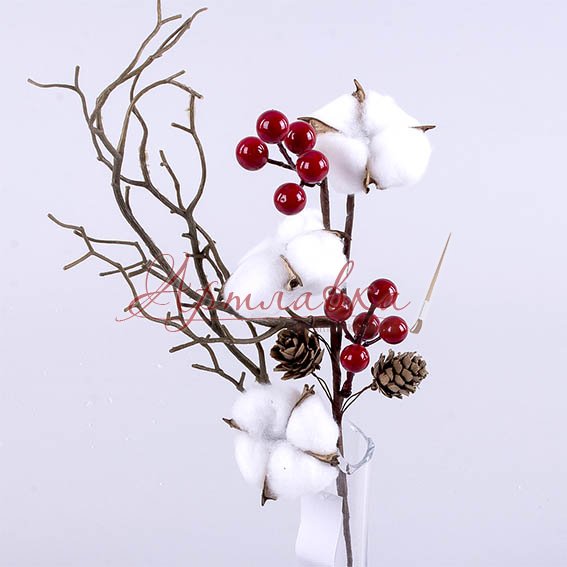 Висота гілочки 32см. Гілочка з бавовною, та новорічним декором чудово підкреслить новорічні композиції