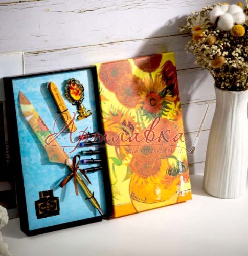 Такий набір на сюжет картина "Соняшники" Ван Гога, неодмінно порадує як професіонала, так і початківця. Ви зможете створювати листи, підписувати листівки та конверти, запечатати за допомогою розплавленого сургуча заповітне послання. І це принесе неодмінне задоволення. Розмір коробки: 16Х26Х4см Купити набір для каліграфії запрошуємо до магазину Артлавка у Києві.