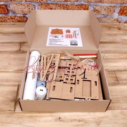Деревяні деталі будиночка, оздоблювальні деталі будиночка, акрилова фарба, клей, робоча серветка , пензлики- 2 шт, текстова інструкція, відеоінструкція .
