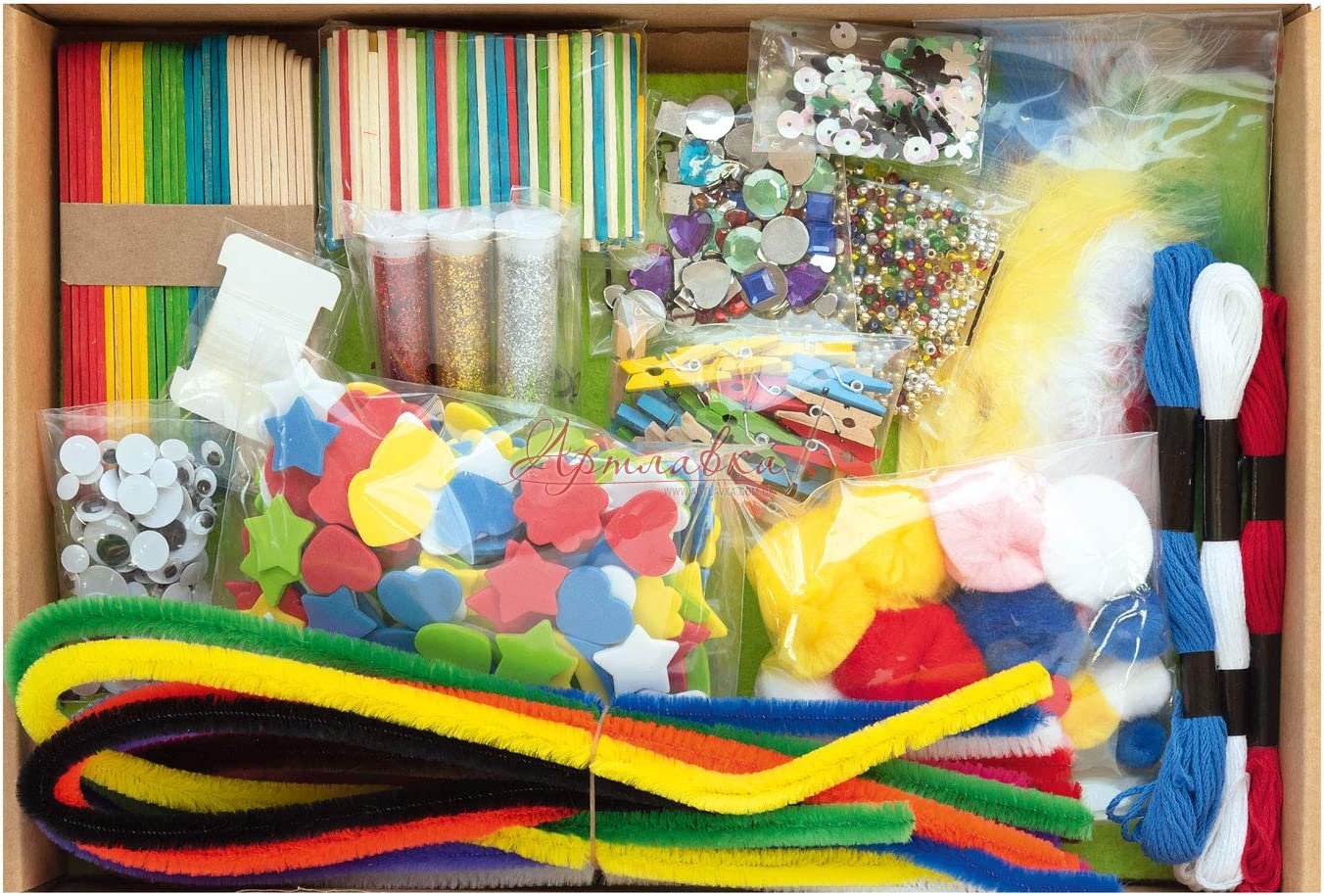 Шикарний набір для творчості, в якому зібрані найпопулярніші та найзатребуваніші матеріали для рукоділля, більш ніж 1300 штук. У набір входять: очі, що ворушаться, фетр для рукоділля, перфоровані деталі з поролону, дорогоцінне каміння, синєльний дріт, помпони, дерев'яні затискачі, дерев'яшки для рукоділля, палички-кобури, намистини, паєтки, пір'я з флісу, нитки для вишивання, та нейлонова нитка. Барвиста суміш матеріалів для творчих та творчих виробів та декорування – мрія будь-якої дівчинки. Маючи такі матеріали, можна створювати вироби у різних техніках, робити іграшки, сувеніри, брелочки, листівки, новорічні прикраси, великодні композиції та сюрпризи та декор до будь-якого свята.