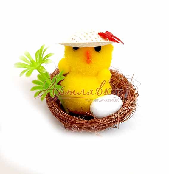 Весняна композиція для великоднього декору - курча в капелюшку в гнізді. Відмінно прикрасить різні вироби, шкільний або домашній декор, віночки на двері, прикраси для кошиків або інсталяція на святковий стіл.