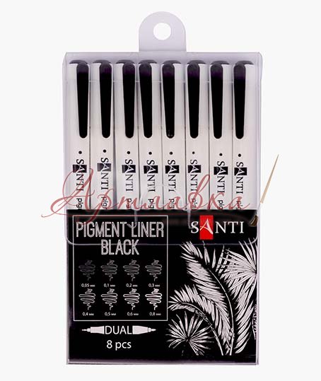 Набір лінерів "Santi" 8 шт, пігментні, двосторонні. Колір чорний. Товщина ліній: 0,05; 0,1; 0,2; 0,3; 0,4; 0,5; 0,6; 0,8; мм. Призначені для малювання, креслень, скетчінга і дудлінга. Водостійкі дрібнопігментні чорнила забезпечують чітку безперервну лінію, яка не втрачає кольору під впливом повітря, світла і вологи. Не токсичні, без запаху.