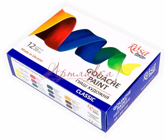 В наборі професійної гуаші входять такі кольори - білила титанові, жовта світла, вохра натуральна, червона, червона темна, фіолетова, ультрамарин, синя темна, зелена світла, зелена темна, коричнева темна, чорна.