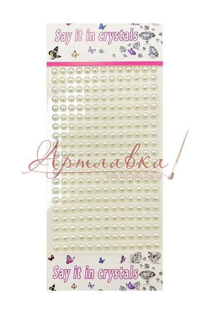 Клейові напівперлини для декорування листівок, альбомів, виробів із тканини. Зручно користуватися, просто зняти з прозорої плівки і притиснути до потрібного виробу. Розмір упакування 10*15см.