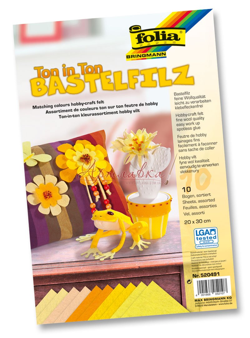 У наборі Folia "Відтінки жовтого" 10 аркушів фетру, розміром 20*30см в однієї колірній гамі, що дозволяє створювати дивні вироби й робити гарні колірні переходи в одному стильовому розв'язку.