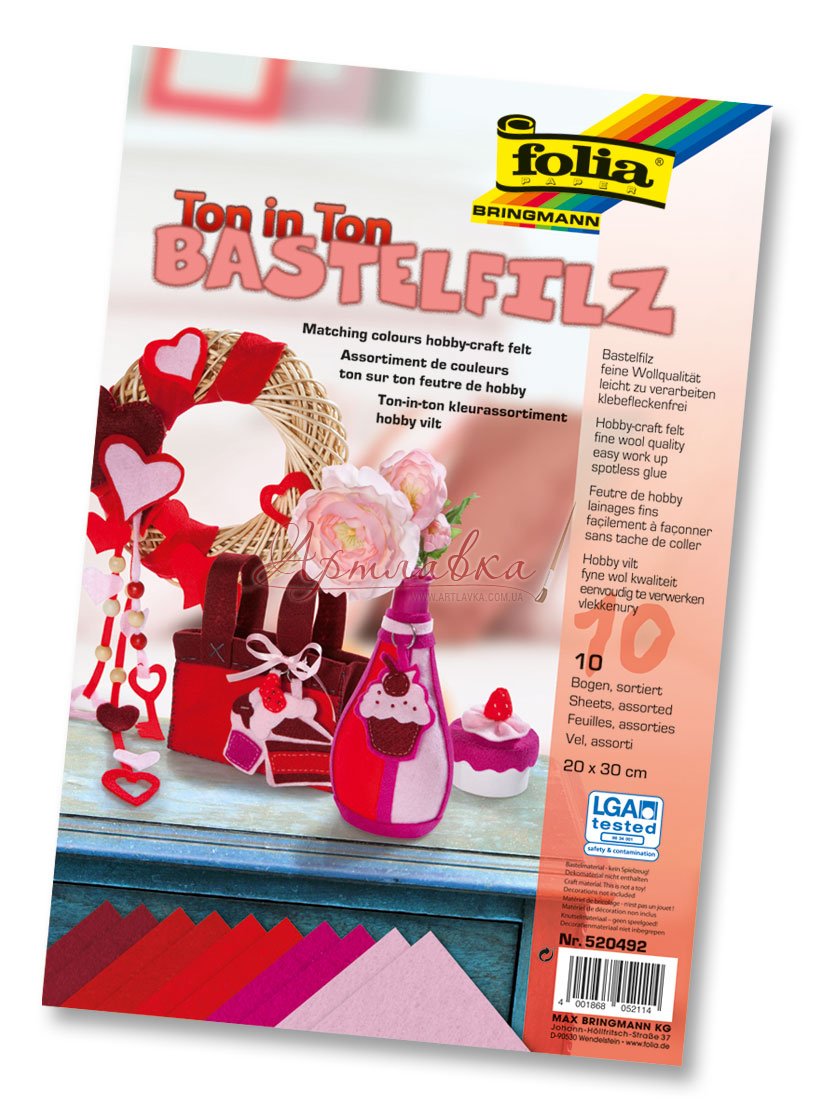 У наборі Folia "Відтінки червоного" 10 аркушів фетру, розміром 20*30см в однієї колірній гамі, що дозволяє створювати дивні вироби й робити гарні колірні переходи в одному стильовому розв'язку.