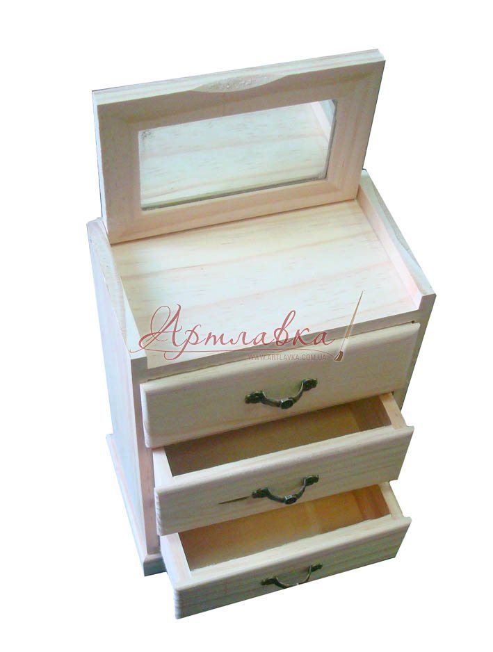 Жодна дівчина не може обійтися без дзеркальця. Комод із дзеркальцем- прекрасне пропозиції для створення оригінального трюмо й декорування в техніках декупаж. Висота трюмо в розкладеному виді із дзеркальцем 29см.