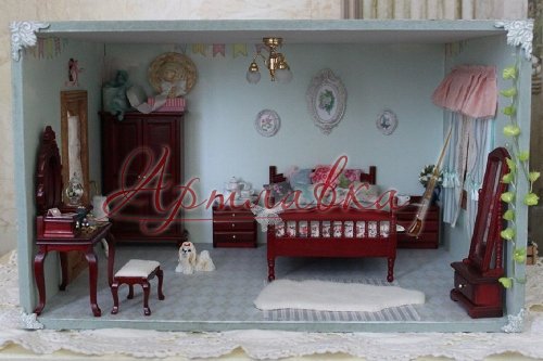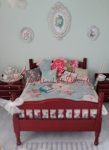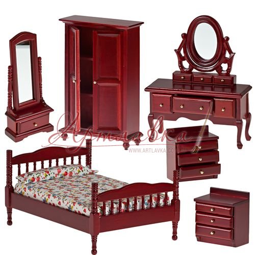 Комплексний набір меблів для спальні із цінної деревини махагон для лялькової мініатюри, у популярному розмірі 1:12